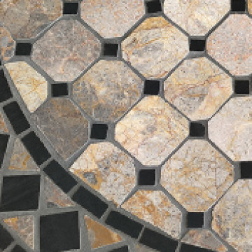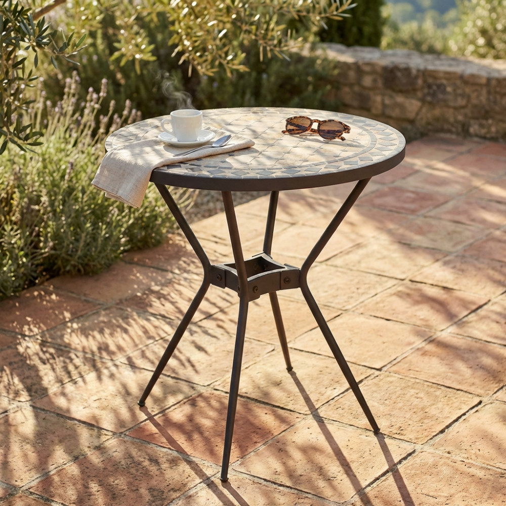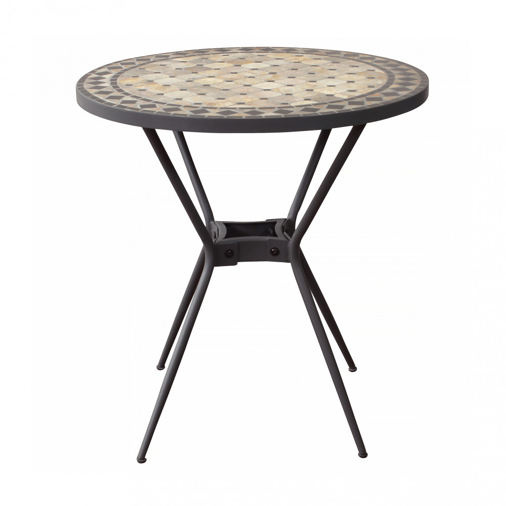 Piano ovale con mosaico beige e antracite base in ferro verniciato a polvere antracite Dimensioni: cm 70 Ø x 72 h