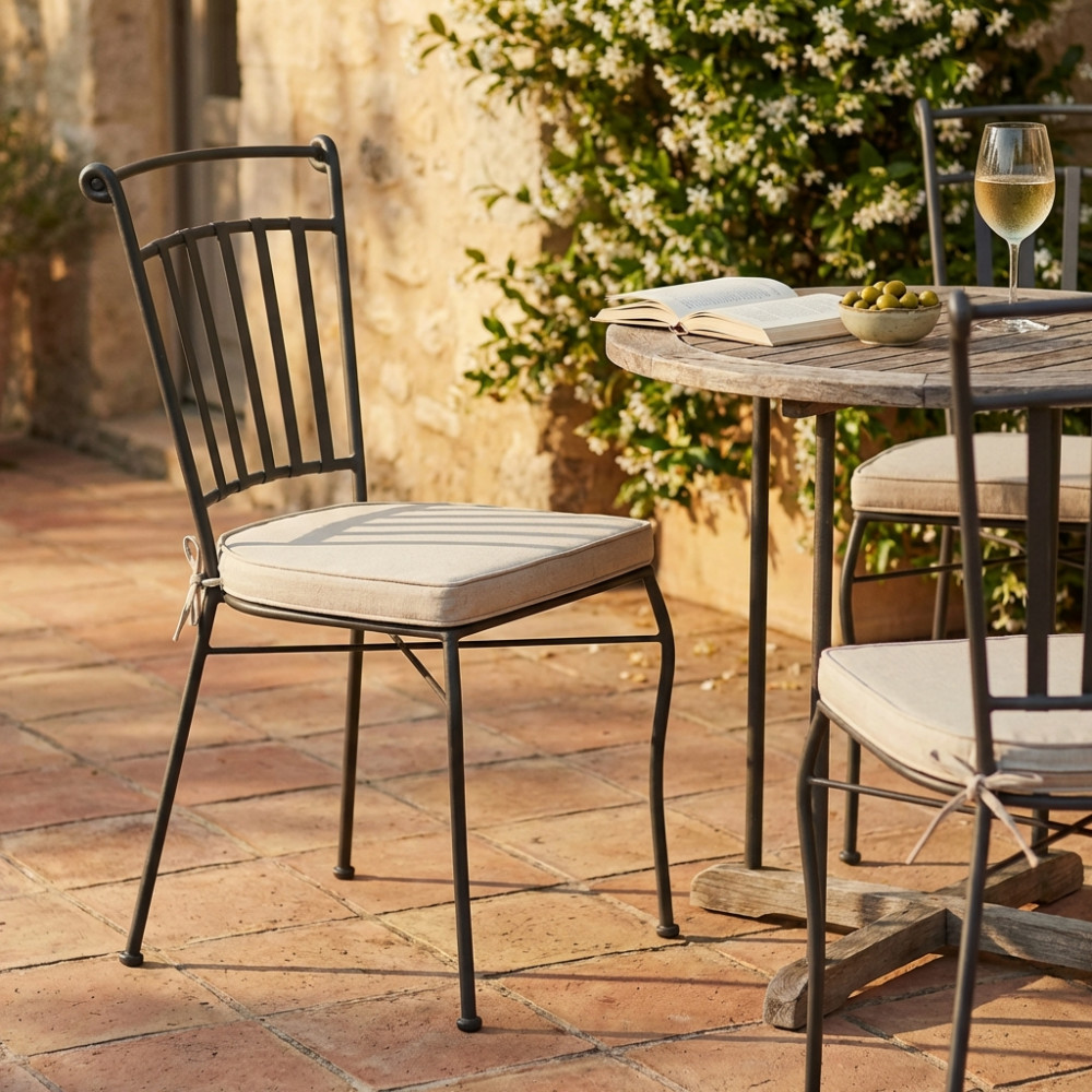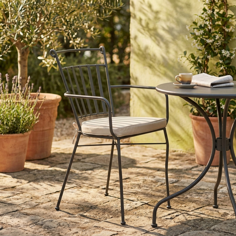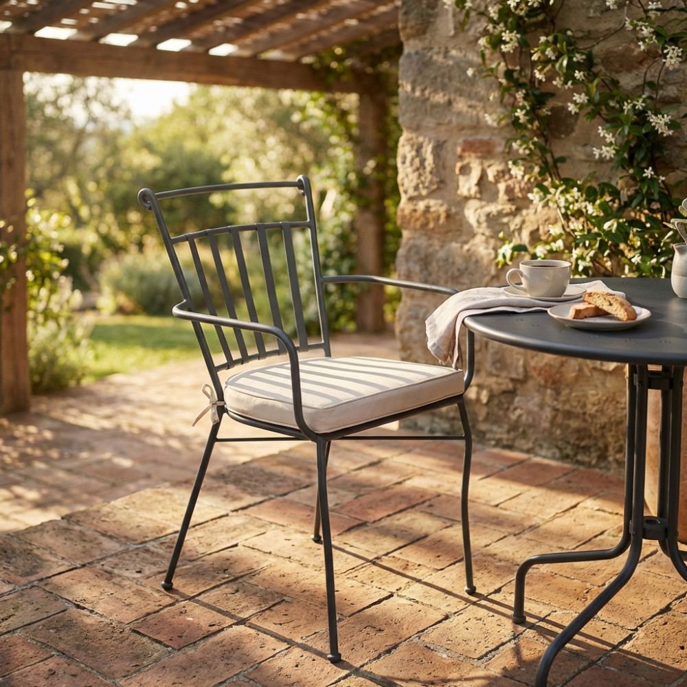 - Dati Tecnici Poltrona in ferro verniciato a polvere antracite cuscino ecru Dimensioni: cm 53 l x 51 p x 90 h
