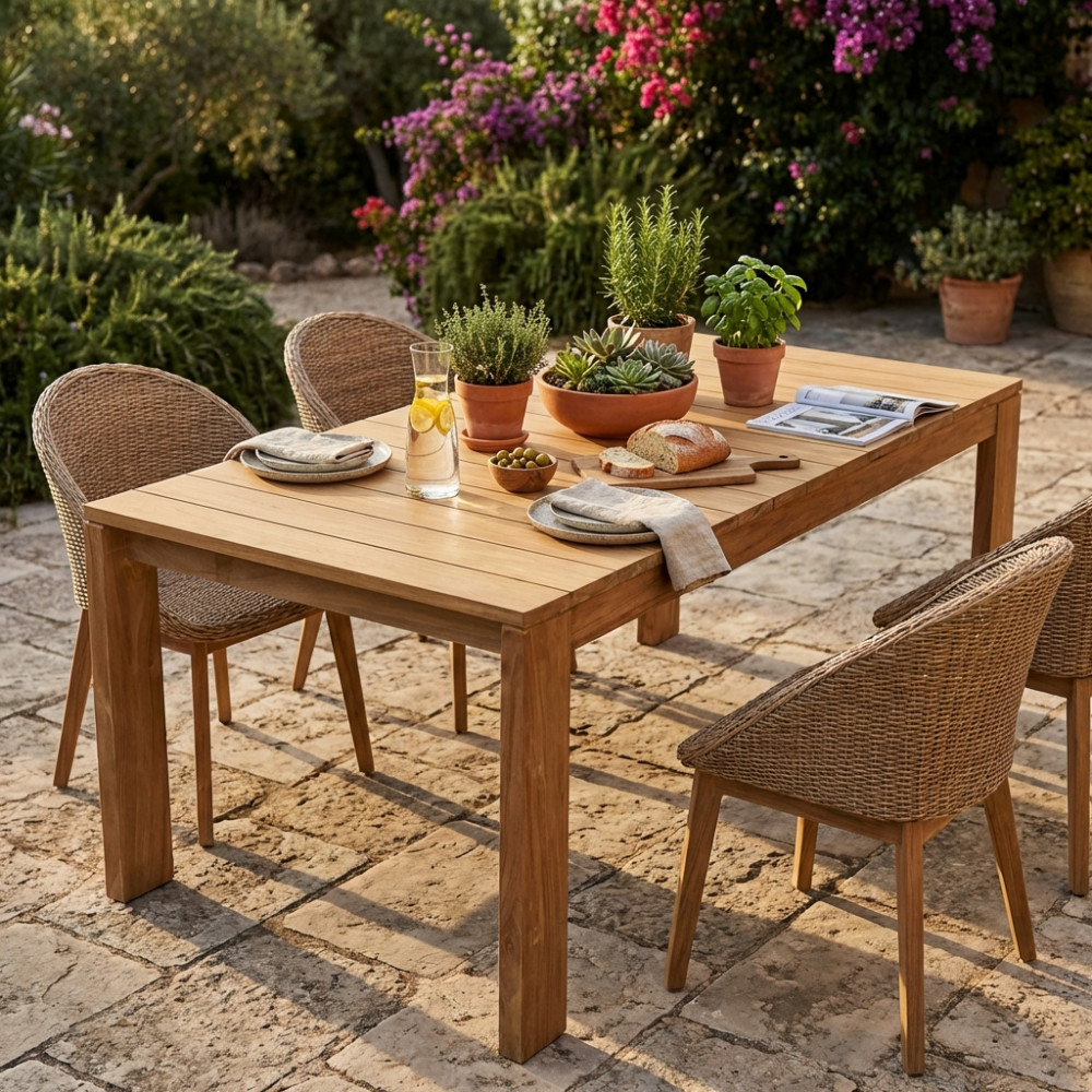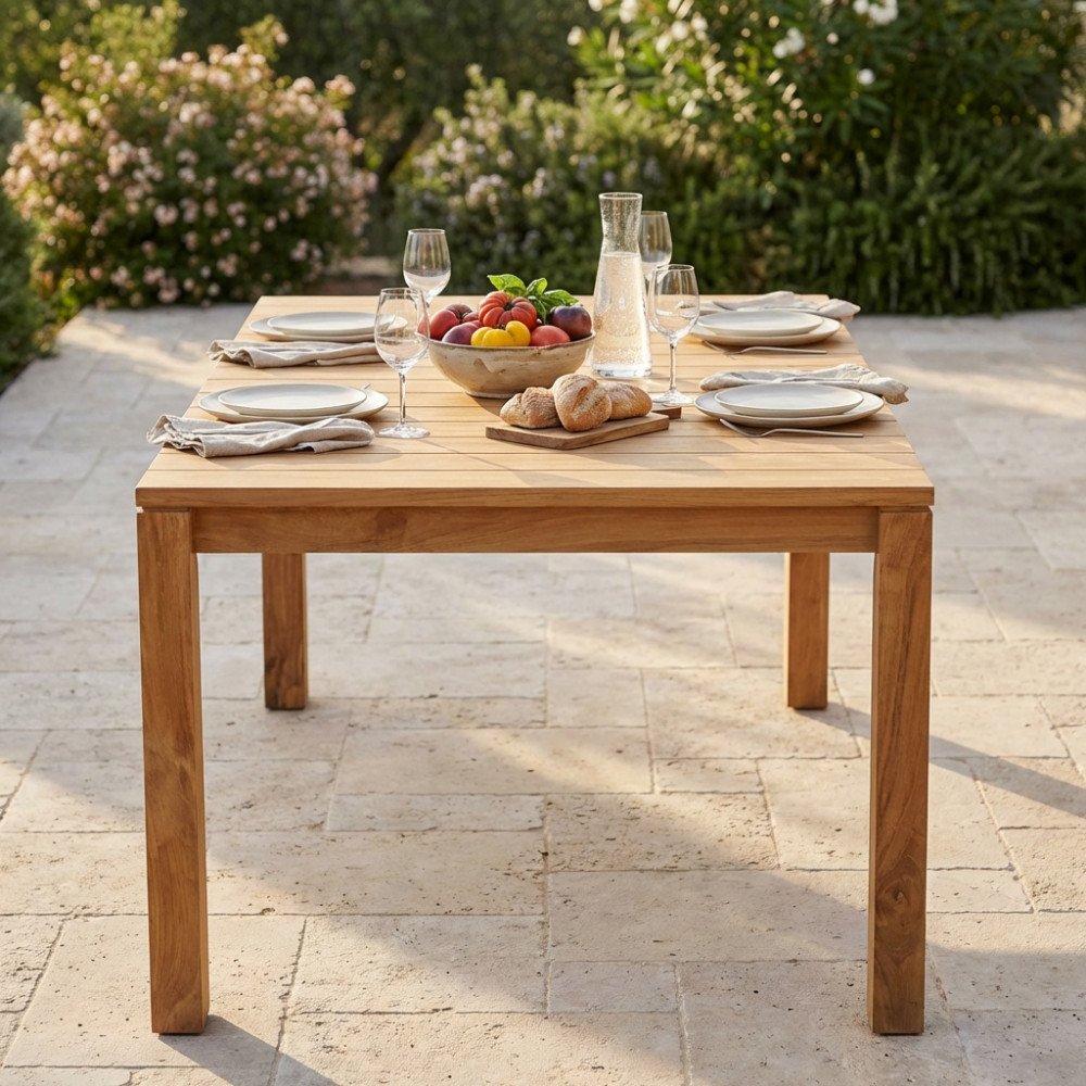 - Dati Tecnici Tavolo in teak spessore piano 16 cm Dimensioni: cm 200 l x 100 p x 75 h