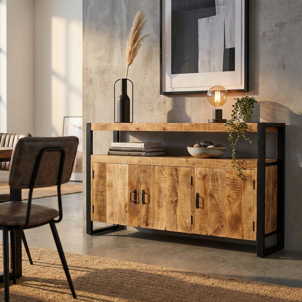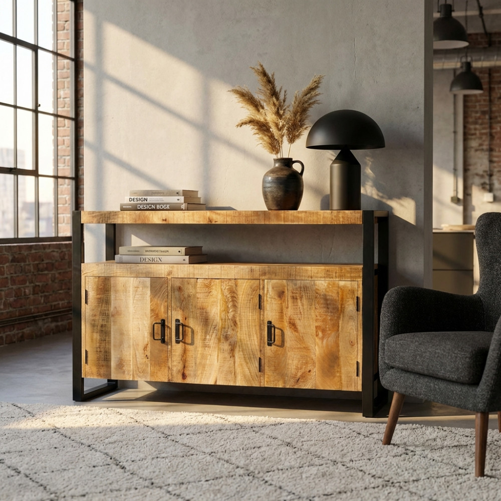 - Dati Tecnici Mobile in legno di mango con 3 ante Dimensioni: cm 150 l x 40 p x 90 h