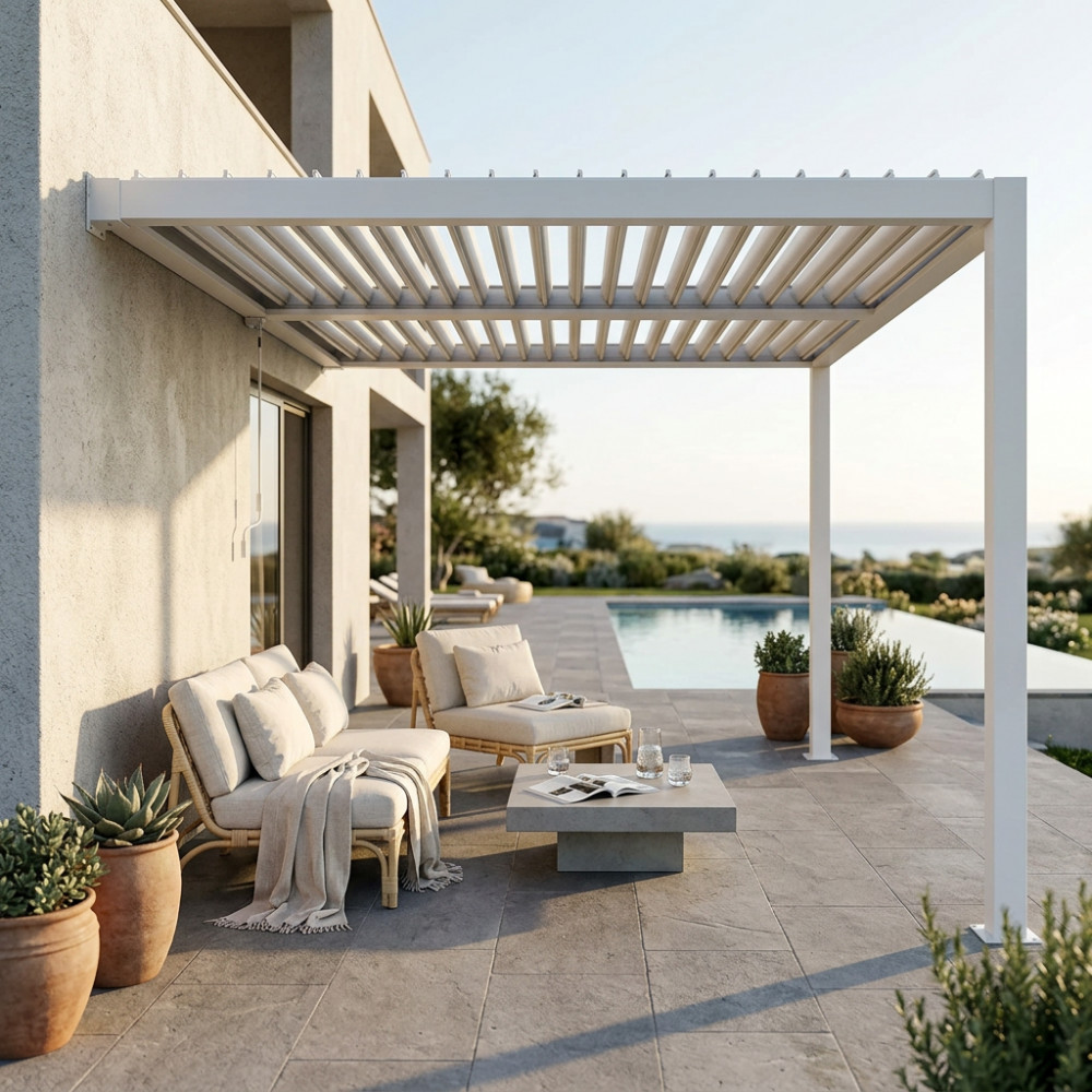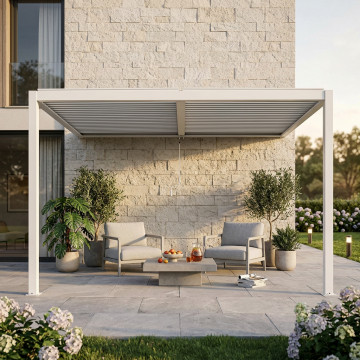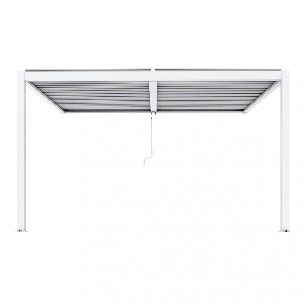 Struttura in alluminio bianco o grigio scuro copertura a lamelle frangisole orientabili a movimentazione manuale Dimensioni: cm 297 l x 256 p x 245 h