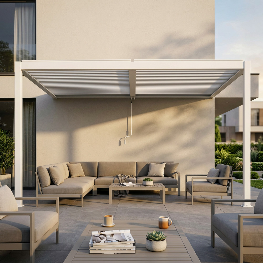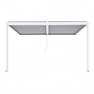 Struttura in alluminio bianco o grigio scuro copertura a lamelle frangisole orientabili a movimentazione manuale Dimensioni: cm 396 l x 256 p x 245 h